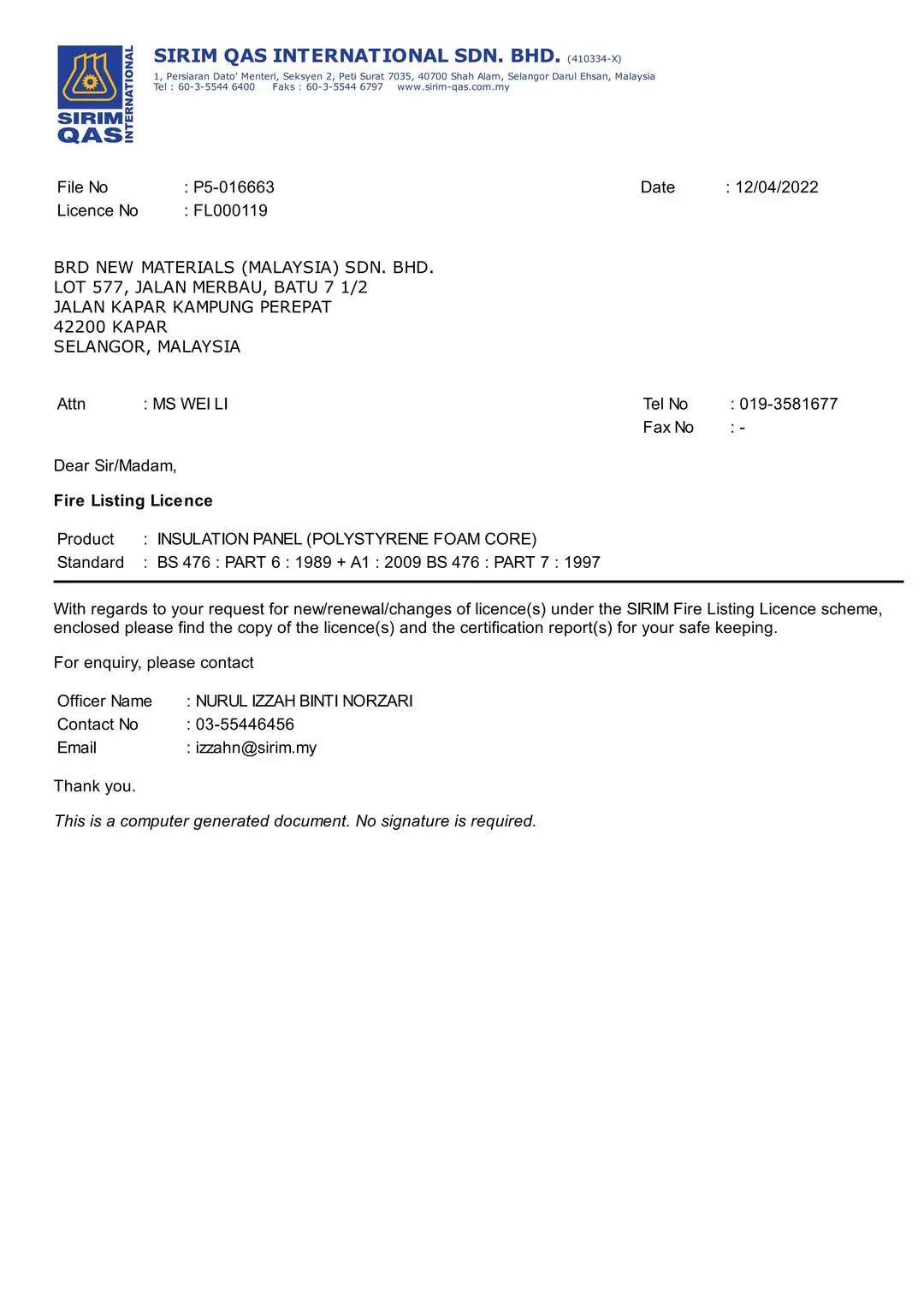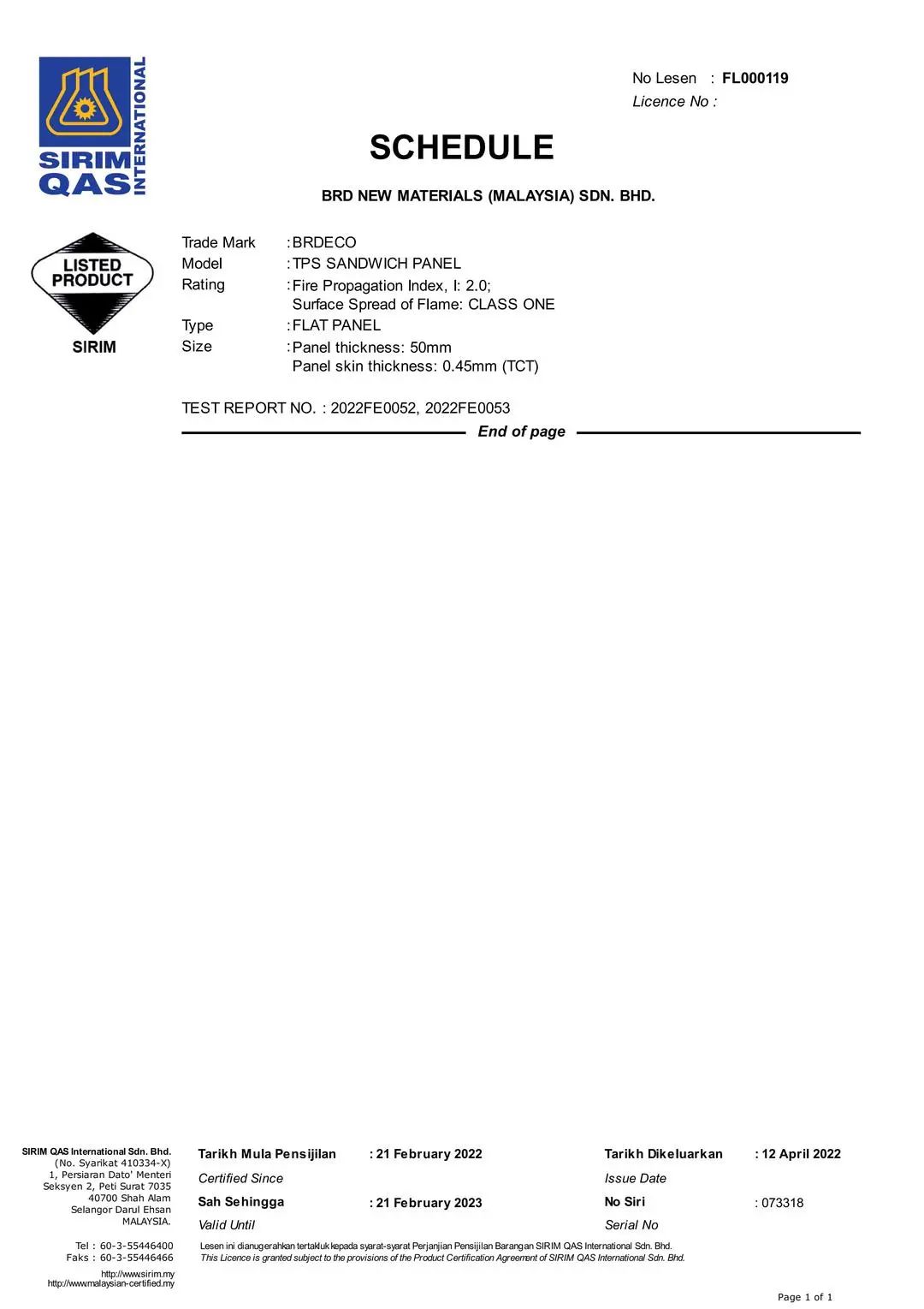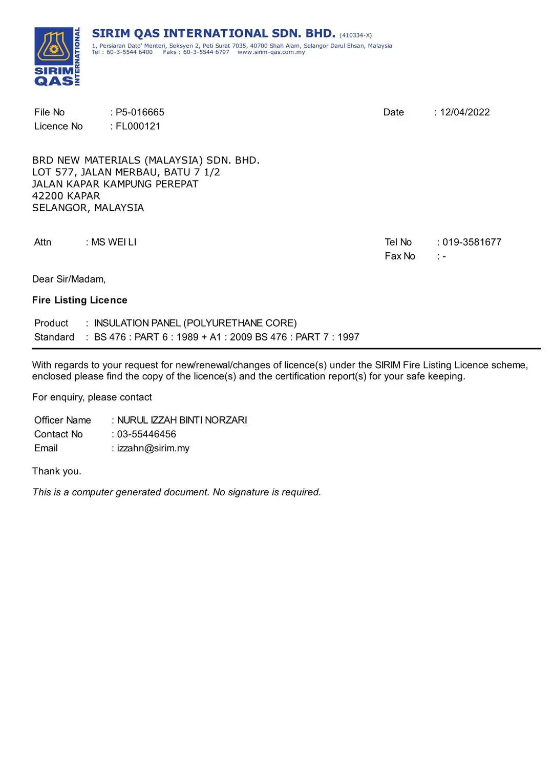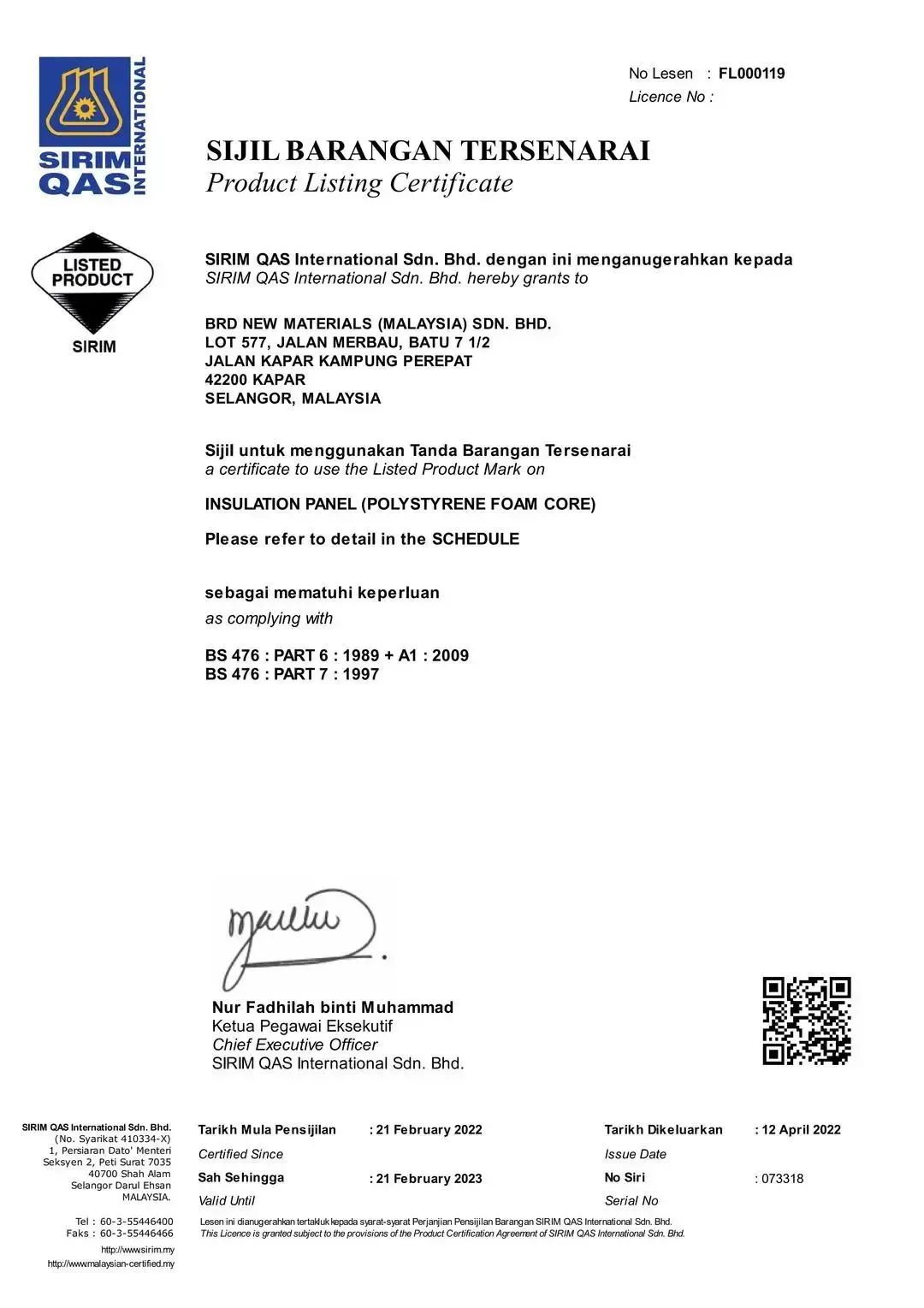 寶潤達新材馬來西亞公司已獲聚氨酯復合板防火證書并通過馬來西亞聚氨酯復合板SIRIM防火檢測。