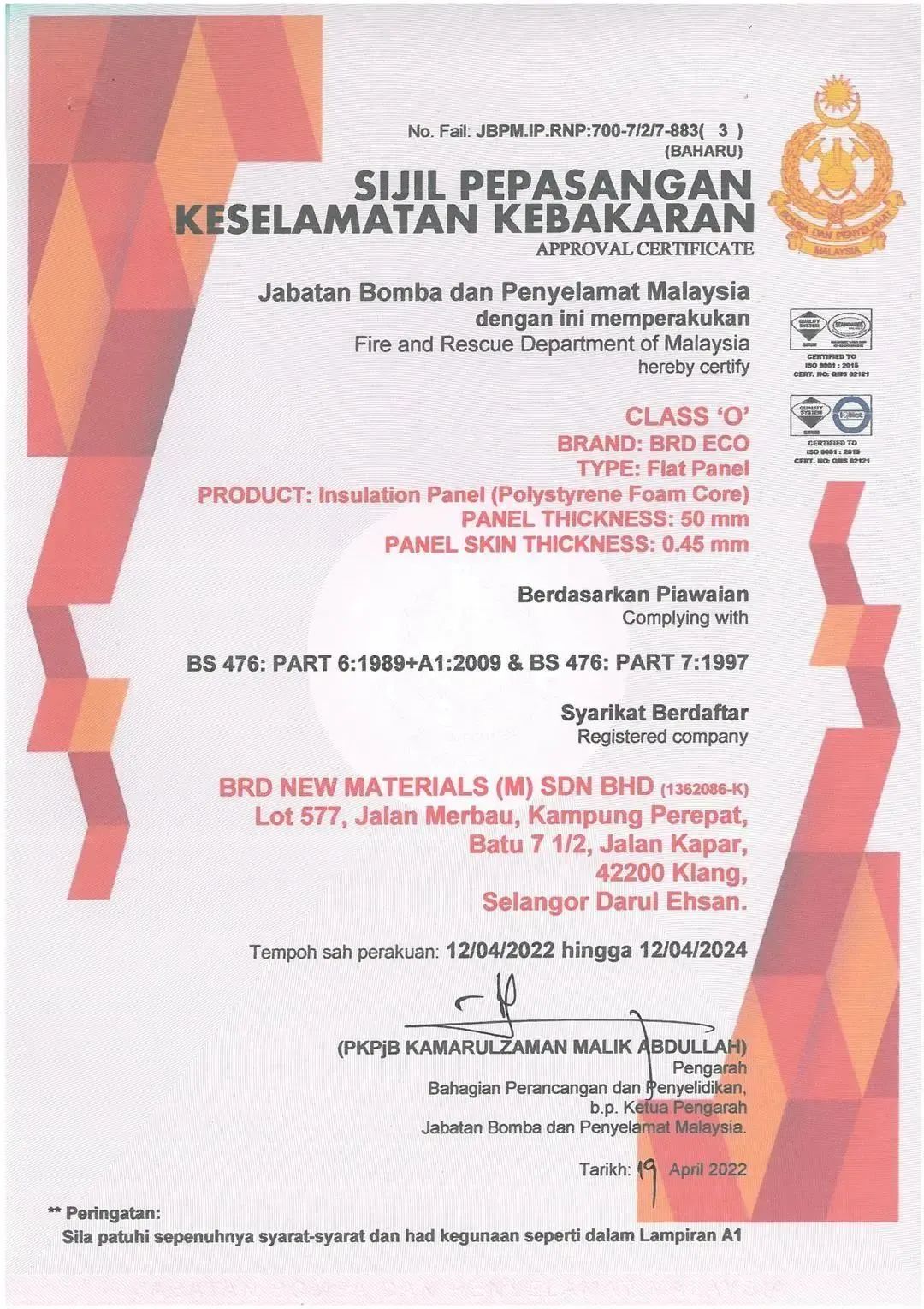 這代表寶潤達新材馬來西亞公司生產的節能環保聚氨酯復合板的防火性能已獲得高度認可。