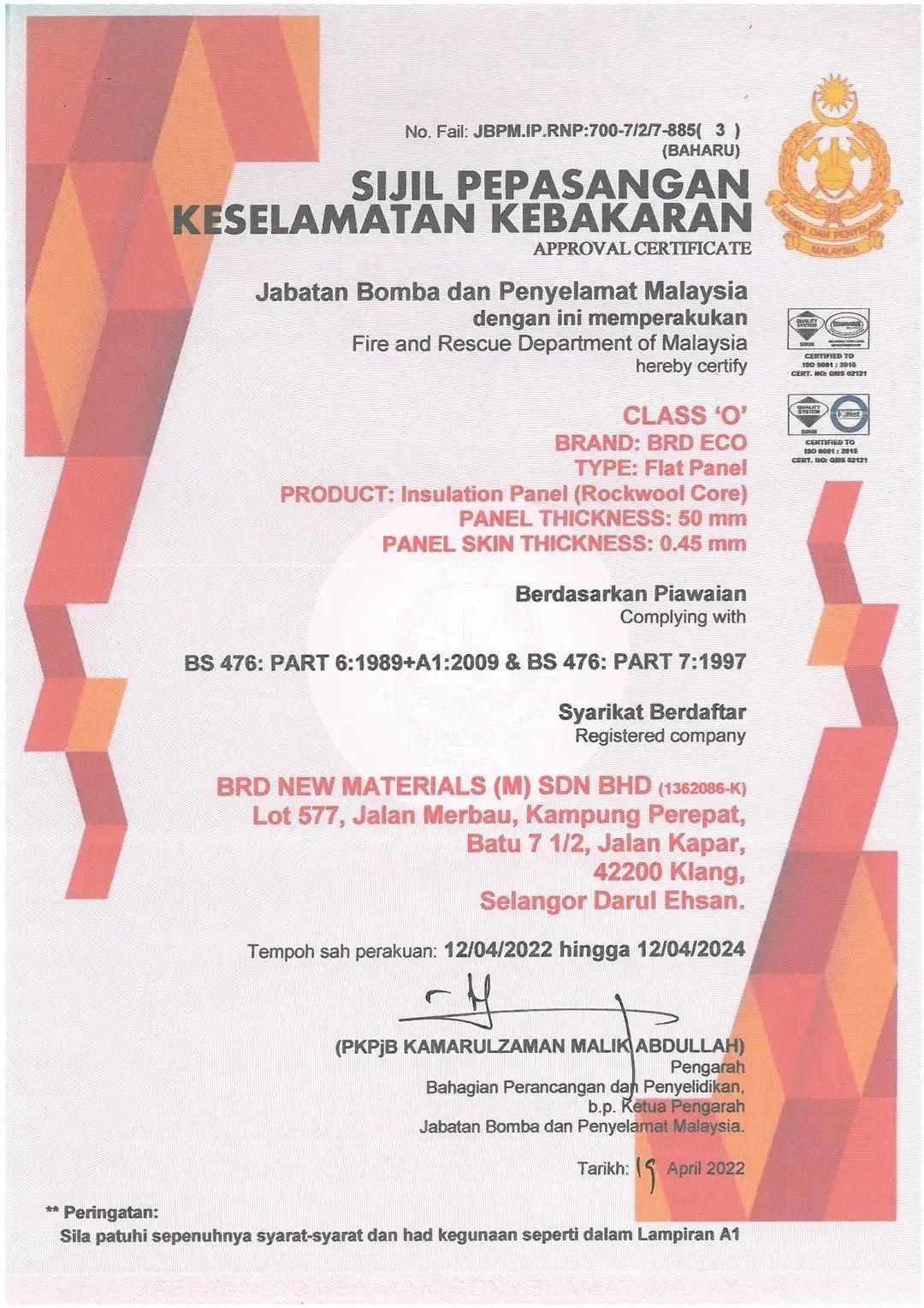 這代表寶潤達新材馬來西亞公司生產的節能環保巖棉復合板的防火性能已獲得高度認可。